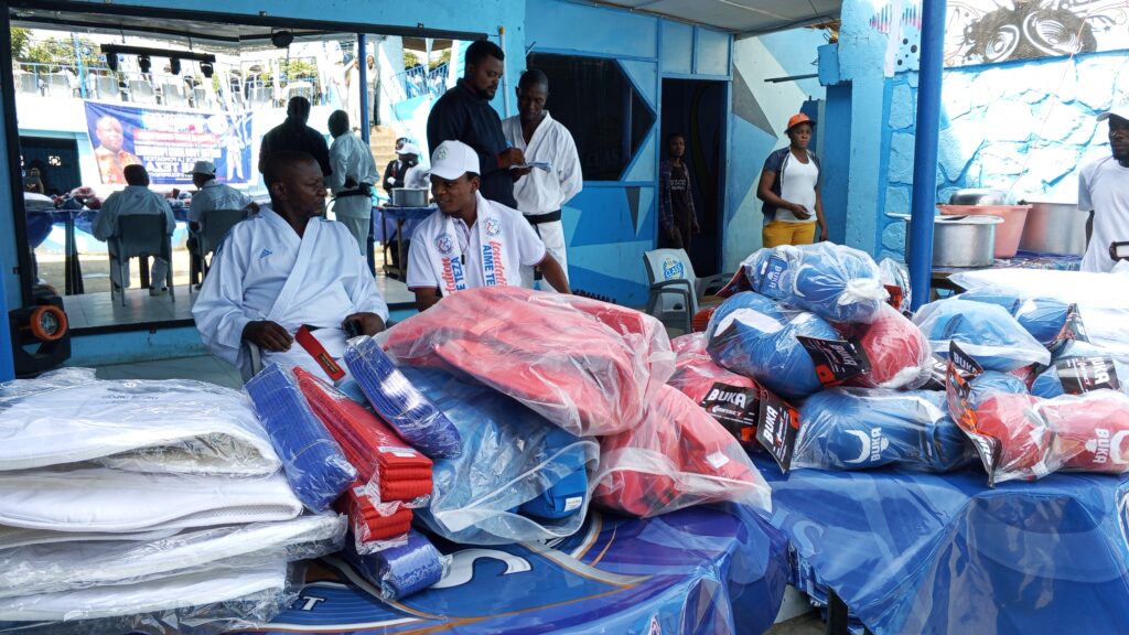 Le point d’orgue de cette journée s’est déplacé vers la cérémonie officielle de remise d’équipements sportifs. Sur les tables, le spectacle était saisissant : kimonos neufs, gants, souchons, plastrons, protège-dents et ceintures brillaient sur la table. Un arsenal complet d’équipements offert par la Fondation Aimé Teza, marquant un tournant historique pour le Karaté dans la province de la Tshopo.